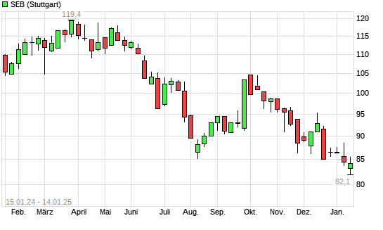 Mit dem Rücksetzer auf 82,50 EUR hat die SEB-Aktie (ISIN FR0000121709) am 13.01.2025 ein neues 12-Monats-Tief erreicht und damit den Kurs vom 09.01.2025 eingestellt.