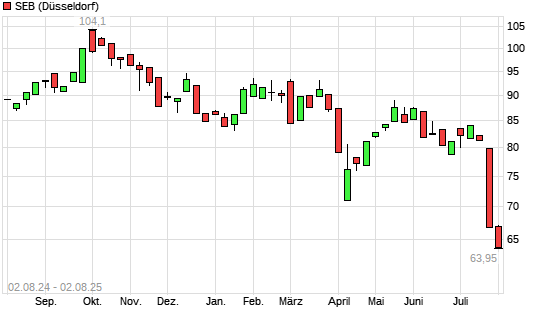 Mit dem Rücksetzer auf 64,00 EUR hat die SEB-Aktie (ISIN FR0000121709) am 01.08.2025 ein neues 12-Monats-Tief erreicht und damit den Kurs vom 31.07.2025 eingestellt.
