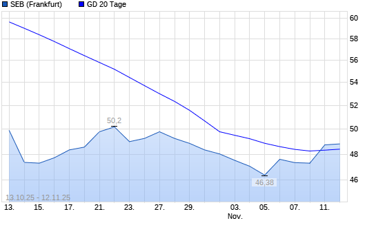 Mit dem Anstieg auf 48,74 EUR hat die SEB-Aktie am 11.11.2025 die 20-Tage-Linie nach oben gekreuzt.Die SEB-Aktie befindet sich seit dem 20.03.2025 im langfristigen Abwärtstrend und hat in diesem ...weiterlesen