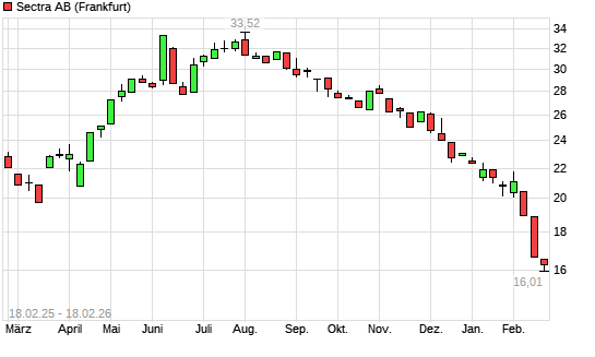 Mit dem Rücksetzer auf 16,51 EUR hat die SECTRA AB-Aktie (ISIN SE0022419784) am 17.02.2026 ein neues 12-Monats-Tief erreicht und damit den Kurs vom 16.02.2026 eingestellt.Die ...weiterlesen