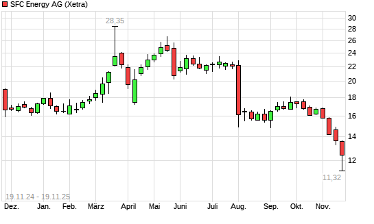 Mit dem Rücksetzer auf 12,08 EUR hat die SFC Energy-Aktie (ISIN DE0007568578) am 18.11.2025 ein neues 5-Jahres-Tief erreicht und damit den Kurs vom 17.11.2025 eingestellt.