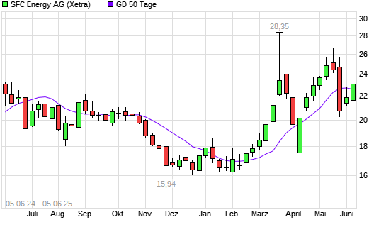 Mit dem Anstieg auf 23,00 EUR hat die SFC Energy-Aktie am 04.06.2025 die 50-Tage-Linie nach oben gekreuzt.