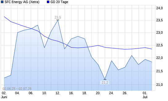 Mit dem Rücksetzer auf 21,80 EUR hat die SFC Energy-Aktie am 01.07.2025 die 20-Tage-Linie nach unten gekreuzt.