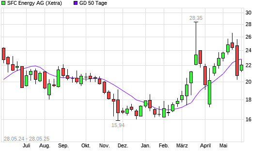 Mit dem Rücksetzer auf 22,45 EUR hat die SFC Energy-Aktie am 27.05.2025 die 50-Tage-Linie nach unten gekreuzt.