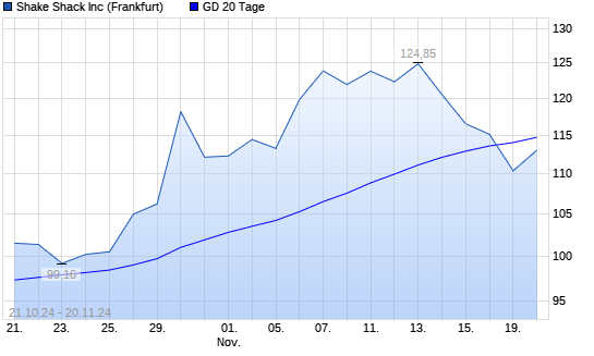 Mit dem Rücksetzer auf 110,35 EUR hat die SHAKE SHACK  A-Aktie am 19.11.2024 die 20-Tage-Linie nach unten gekreuzt.