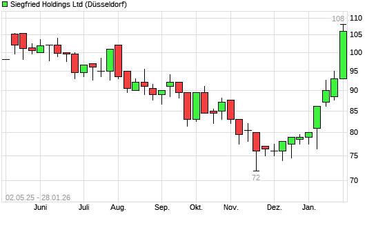 Mit dem Anstieg auf 105,00 EUR hat die SIEGFRIED N1-Aktie (ISIN CH1429326825) am 27.01.2026 ein neues 6-Monats-Hoch erreicht und damit den Kurs vom 28.07.2025 eingestellt.