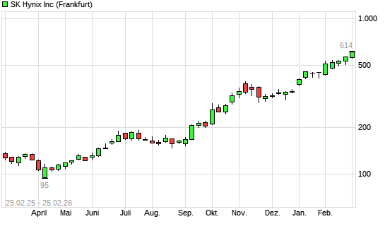 Mit dem Anstieg auf 614,00 EUR hat die SK Hynix-Aktie (ISIN US78392B1070) am 24.02.2026 ein neues All-Time-High erreicht und damit den Kurs vom 20.02.2026 eingestellt.