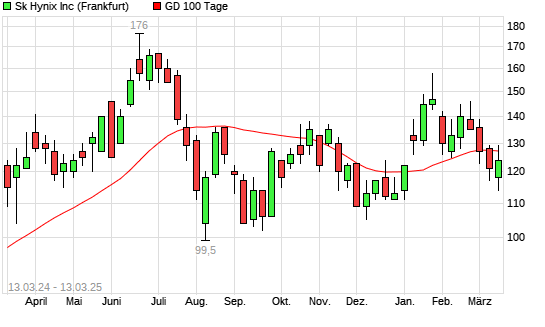 Mit dem Anstieg auf 129,00 EUR hat die SK Hynix-Aktie am 12.03.2025 die 100-Tage-Linie nach oben gekreuzt.
