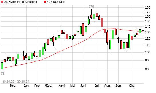Mit dem Rücksetzer auf 127,00 EUR hat die SK Hynix-Aktie am 29.10.2024 die 100-Tage-Linie nach unten gekreuzt.