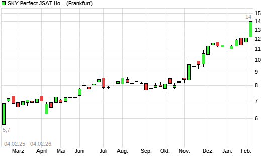 Mit dem Anstieg auf 12,60 EUR hat die SKY Perfect JSAT Holdings-Aktie (ISIN JP3396350005) am 03.02.2026 ein neues All-Time-High erreicht und damit den Kurs vom 19.01.2026 eingestellt.