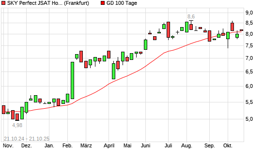 Mit dem Anstieg auf 8,20 EUR hat die SKY Perfect JSAT Holdings-Aktie am 20.10.2025 die 100-Tage-Linie nach oben gekreuzt.Die SKY Perfect JSAT Holdings-Aktie befindet sich seit dem 29.11.2024 ...weiterlesen