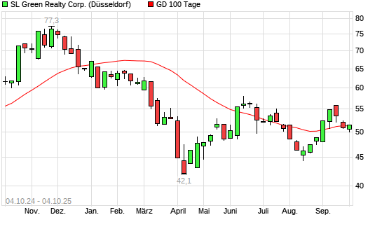 Mit dem Rücksetzer auf 50,48 EUR hat die SL Green Realty-Aktie am 03.10.2025 die 100-Tage-Linie nach unten gekreuzt.
