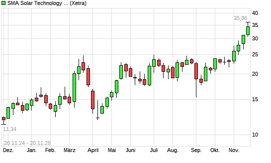 Mit dem Anstieg auf 35,12 EUR hat die SMA Solar-Aktie (ISIN DE000A0DJ6J9) am 19.11.2025 ein neues 12-Monats-Hoch erreicht und damit den Kurs vom 18.11.2025 eingestellt.
