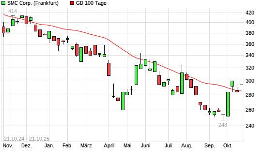 Mit dem Anstieg auf 294,00 EUR hat die SMC-Aktie am 20.10.2025 die 100-Tage-Linie nach oben gekreuzt.