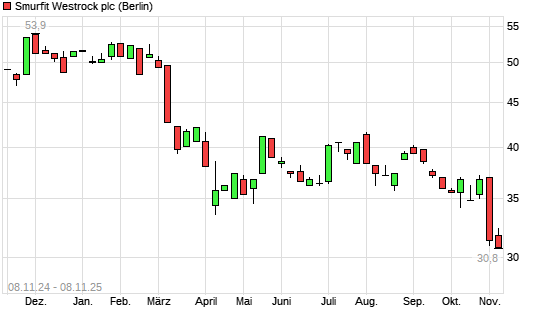 Mit dem Rücksetzer auf 29,80 EUR hat die SMURFIT WESTROCK-Aktie (ISIN IE00028FXN24) am 07.11.2025 ein neues 12-Monats-Tief erreicht und damit den Kurs vom 04.11.2025 eingestellt.
