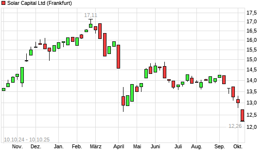 Mit dem Rücksetzer auf 12,43 EUR hat die SOLAR CAPITAL-Aktie (ISIN US83413U1007) am 09.10.2025 ein neues 12-Monats-Tief erreicht und damit den Kurs vom 08.10.2025 eingestellt.