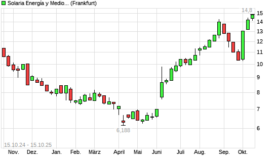 Mit dem Anstieg auf 14,32 EUR hat die SOLARIA ENERGIA-Aktie (ISIN ES0165386014) am 14.10.2025 ein neues 12-Monats-Hoch erreicht und damit den Kurs vom 10.10.2025 eingestellt.