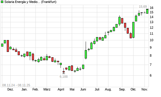 Mit dem Anstieg auf 15,69 EUR hat die SOLARIA ENERGIA-Aktie (ISIN ES0165386014) am 07.11.2025 ein neues 12-Monats-Hoch erreicht und damit den Kurs vom 06.11.2025 eingestellt.