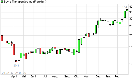 Mit dem Anstieg auf 36,20 EUR hat die SPYRE THERAPEUTICS-Aktie (ISIN US00773J2024) am 23.02.2026 ein neues 12-Monats-Hoch erreicht und damit den Kurs vom 20.02.2026 eingestellt.