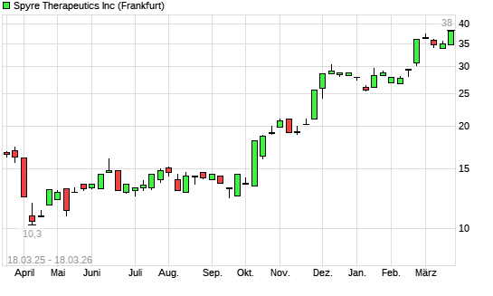 Mit dem Anstieg auf 38,00 EUR hat die SPYRE THERAPEUTICS-Aktie (ISIN US00773J2024) am 17.03.2026 ein neues 12-Monats-Hoch erreicht und damit den Kurs vom 24.02.2026 eingestellt.
