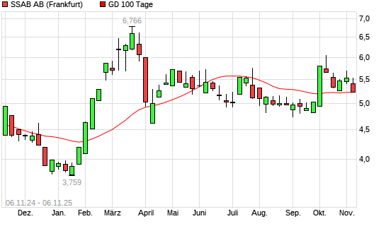 Mit dem Rücksetzer auf 5,22 EUR hat die SSAB-Aktie am 05.11.2025 die 100-Tage-Linie nach unten gekreuzt.