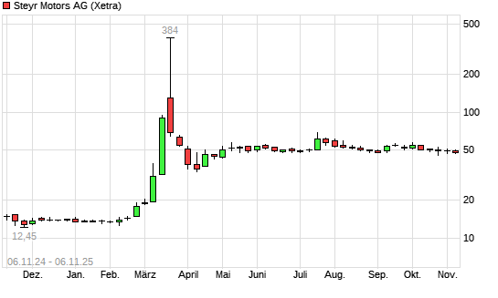 Mit dem Rücksetzer auf 46,90 EUR hat die STEYR MOTORS AG-Aktie (ISIN AT0000A3FW25) am 05.11.2025 ein neues 6-Monats-Tief erreicht und damit den Kurs vom 04.11.2025 eingestellt.