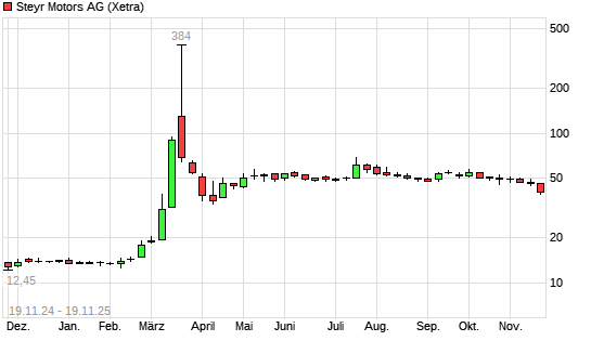 Mit dem Rücksetzer auf 41,40 EUR hat die STEYR MOTORS AG-Aktie (ISIN AT0000A3FW25) am 18.11.2025 ein neues 6-Monats-Tief erreicht und damit den Kurs vom 17.11.2025 eingestellt.