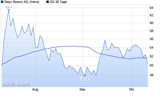 Mit dem Rücksetzer auf 51,00 EUR hat die STEYR MOTORS AG-Aktie am 10.10.2025 die 38-Tage-Linie nach unten gekreuzt.Der Abstand zur 200-Tage-Linie beträgt aktuell +13,35%.