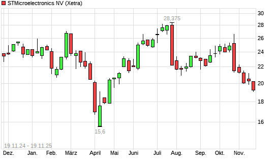 Mit dem Rücksetzer auf 19,30 EUR hat die STMicroelectronics-Aktie (ISIN NL0000226223) am 18.11.2025 ein neues 6-Monats-Tief erreicht und damit den Kurs vom 14.11.2025 eingestellt.