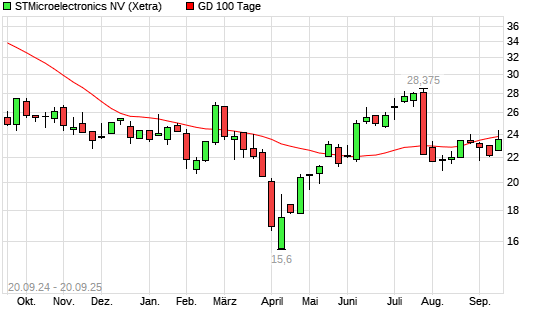 Mit dem Rücksetzer auf 23,52 EUR hat die STMicroelectronics-Aktie am 19.09.2025 die 100-Tage-Linie nach unten gekreuzt.