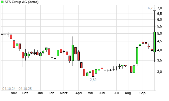 Mit dem Anstieg auf 4,50 EUR hat die STS Group-Aktie (ISIN DE000A1TNU68) am 03.10.2025 ein neues 6-Monats-Hoch erreicht und damit den Kurs vom 01.09.2025 eingestellt.