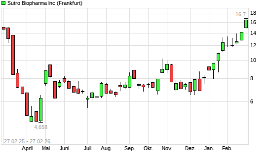 Mit dem Anstieg auf 16,70 EUR hat die SUTRO BIOPHARMA-Aktie (ISIN US8693672011) am 26.02.2026 ein neues 12-Monats-Hoch erreicht und damit den Kurs vom 25.02.2026 eingestellt.