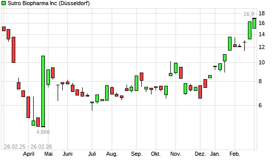 Mit dem Anstieg auf 15,90 EUR hat die SUTRO BIOPHARMA-Aktie (ISIN US8693672011) am 25.02.2026 ein neues 6-Monats-Hoch erreicht und damit den Kurs vom 24.02.2026 eingestellt.
