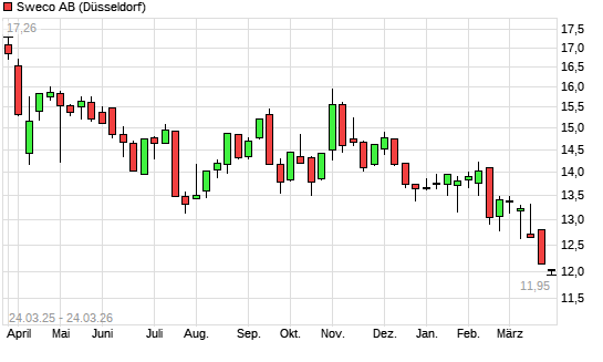 Mit dem Rücksetzer auf 11,94 EUR hat die SWECO AB B-Aktie (ISIN SE0014960373) am 23.03.2026 ein neues 12-Monats-Tief erreicht und damit den Kurs vom 19.03.2026 eingestellt.
