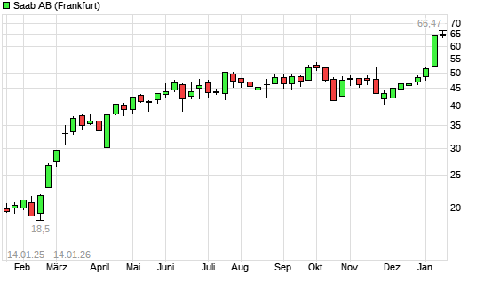 Mit dem Anstieg auf 65,81 EUR hat die Saab AB-Aktie (ISIN SE0021921269) am 13.01.2026 ein neues All-Time-High erreicht und damit den Kurs vom 12.01.2026 eingestellt.