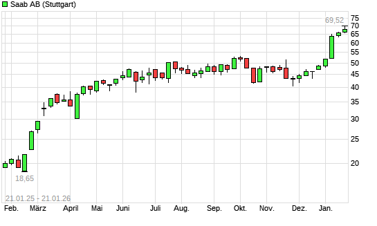 Mit dem Anstieg auf 68,60 EUR hat die Saab AB-Aktie (ISIN SE0021921269) am 20.01.2026 ein neues All-Time-High erreicht und damit den Kurs vom 19.01.2026 eingestellt.