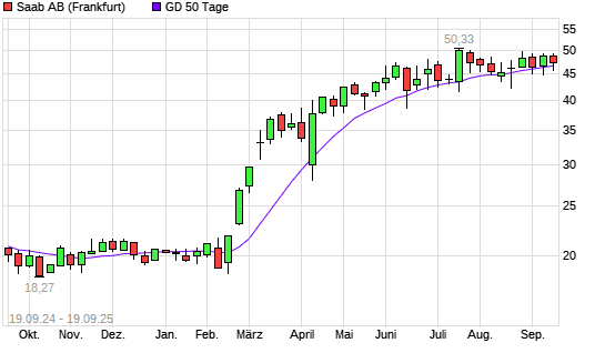 Mit dem Rücksetzer auf 46,29 EUR hat die Saab AB-Aktie am 18.09.2025 die 50-Tage-Linie nach unten gekreuzt.