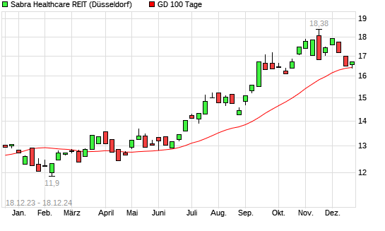 Mit dem Rücksetzer auf 16,40 EUR hat die Sabra Healthcare-Aktie am 17.12.2024 die 100-Tage-Linie nach unten gekreuzt.