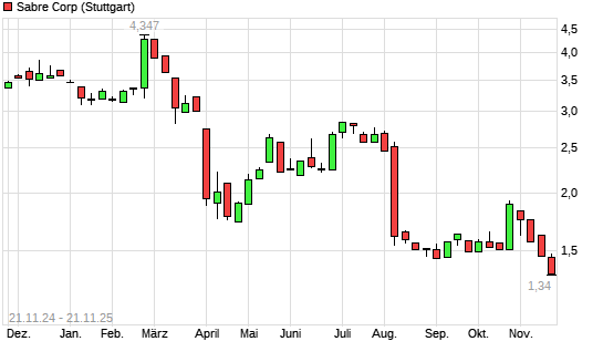 Mit dem Rücksetzer auf 1,38 EUR hat die Sabre-Aktie (ISIN US78573M1045) am 20.11.2025 ein neues All-Time-Low erreicht und damit den Kurs vom 18.11.2025 eingestellt.