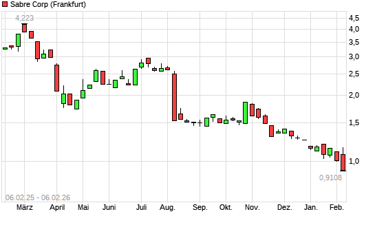Mit dem Rücksetzer auf 0,94 EUR hat die Sabre-Aktie (ISIN US78573M1045) am 05.02.2026 ein neues All-Time-Low erreicht und damit den Kurs vom 30.01.2026 eingestellt.