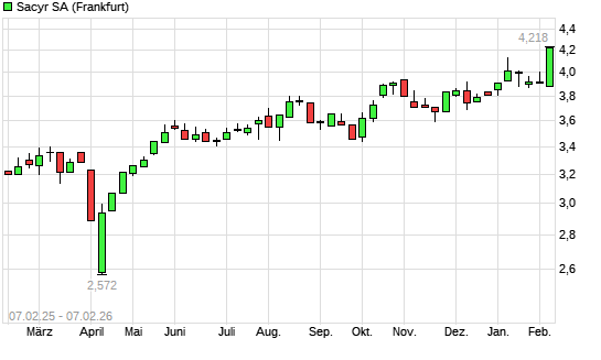 Mit dem Anstieg auf 4,22 EUR hat die Sacyr Vallehermoso S.A. Acciones Port.-Aktie (ISIN ES0182870214) am 06.02.2026 ein neues 10-Jahres-Hoch erreicht und damit den Kurs vom 07.01.2026 eingestellt.