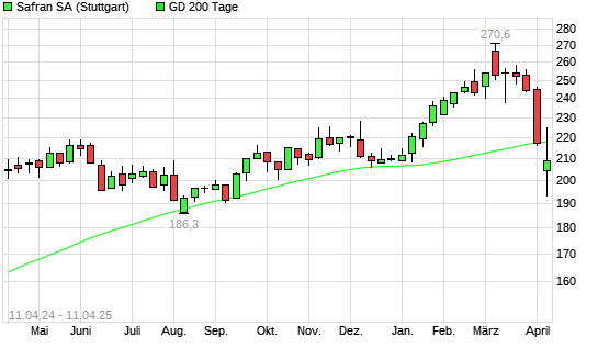 Mit dem Anstieg auf 219,40 EUR hat die Safran-Aktie am 10.04.2025 die 200-Tage-Linie nach oben gekreuzt.