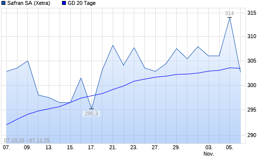 Mit dem Rücksetzer auf 302,70 EUR hat die Safran-Aktie am 06.11.2025 die 20-Tage-Linie nach unten gekreuzt.