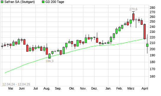 Mit dem Rücksetzer auf 202,00 EUR hat die Safran-Aktie am 11.04.2025 die 200-Tage-Linie nach unten gekreuzt.