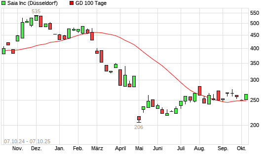 Mit dem Anstieg auf 250,00 EUR hat die Saia-Aktie am 06.10.2025 die 100-Tage-Linie nach oben gekreuzt.