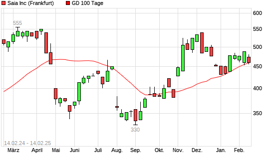 Mit dem Rücksetzer auf 456,00 EUR hat die Saia-Aktie am 13.02.2025 die 100-Tage-Linie nach unten gekreuzt.