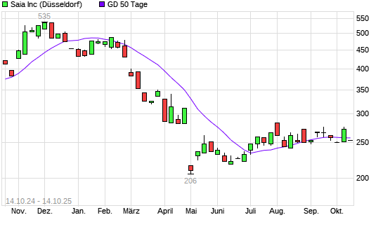Mit dem Rücksetzer auf 250,00 EUR hat die Saia-Aktie am 13.10.2025 die 50-Tage-Linie nach unten gekreuzt.