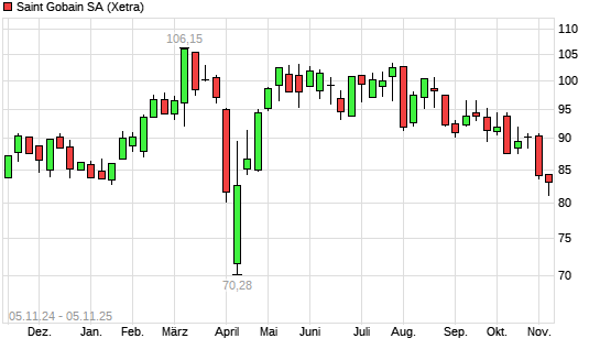 Mit dem Rücksetzer auf 81,48 EUR hat die Saint Gobain-Aktie (ISIN FR0000125007) am 04.11.2025 ein neues 6-Monats-Tief erreicht und damit den Kurs vom 03.11.2025 eingestellt.