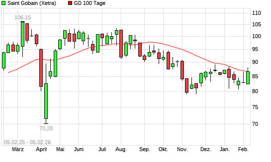 Mit dem Anstieg auf 87,66 EUR hat die Saint Gobain-Aktie am 04.02.2026 die 100-Tage-Linie nach oben gekreuzt.