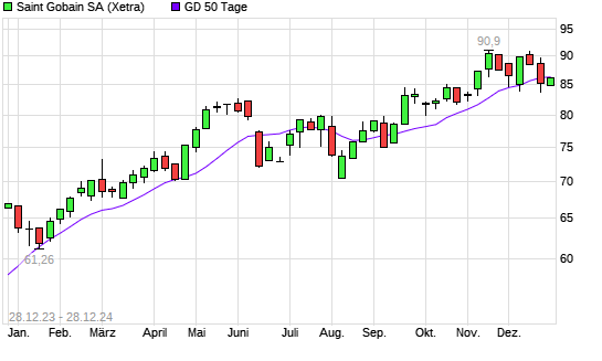 Mit dem Anstieg auf 86,28 EUR hat die Saint Gobain-Aktie am 27.12.2024 die 50-Tage-Linie nach oben gekreuzt.